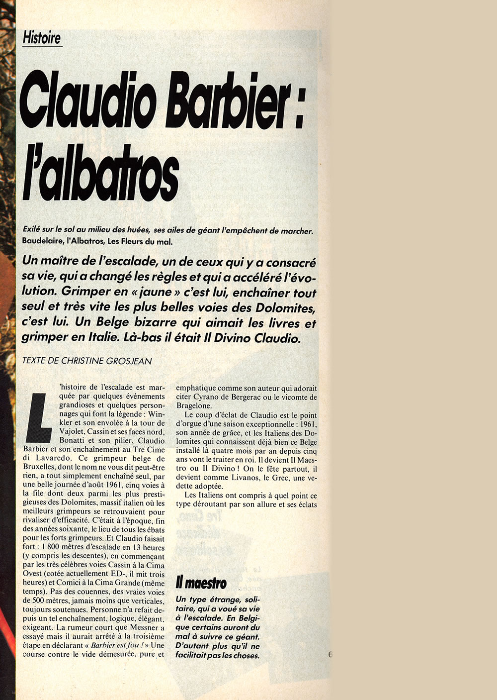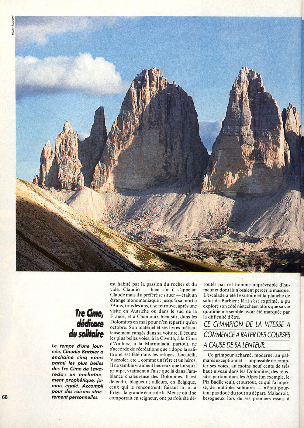 L’histoire de l’escalade est marquée par quelques événements grandioses et quelques personnages qui font la légende : Winkler et son envolée à la tour de Vajolet, Cassin et ses faces nord, Bonatti et son pilier, Claudio Barbier et son enchaînement aux Tre Cime di Lavaredo. Ce grimpeur belge de Bruxelles, dont le nom ne vous dit peut-être rien, a tout simplement enchaîné seul, par une belle journée d’août 1961, cinq voies à la file dont deux parmi les plus prestigieuses des Dolomites, massif italien où les meilleurs grimpeurs se retrouvaient pour rivaliser d’efficacité. C’était à l’époque, fin des années soixante (1), le lieu de tous les ébats pour les forts grimpeurs. Et Claudio faisait fort : 1 800 mètres d’escalade en 13 heures (y compris les descentes), en commençant par les très célèbres voies Cassin à la Cima Ouest (cotée actuellement ED-, il mit trois heures) et Comici à la Cima Grande (même temps). Pas des couennes, des vraies voies de 500 mètres, jamais moins que verticales, toujours soutenues. Personne n’a refait depuis un tel enchaînement, logique, élégant, exigeant. La rumeur court que Messner a essayé mais il aurait arrêté à la troisième étape en déclarant «Barbier est fou !» Une course contre le vide démesurée, pure et emphatique comme son auteur qui adorait citer Cyrano de Bergerac ou le vicomte de Bragelone.