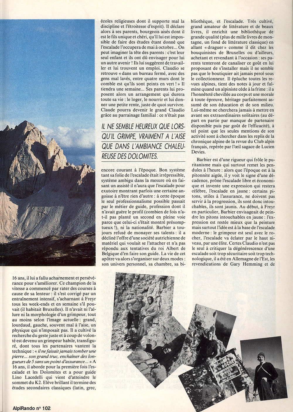 Les Italiens ont compris à quel point ce type déroutant par son allure et ses éclats est habité par la passion du rocher et du vide. Claudio – bien sûr il s’appelait Claude mais il a préféré se situer – était un étrange monomaniaque : jusqu’à sa mort à 39 ans, tous les ans, il se retrouve, après une visite en Autriche ou dans le sud de la France, et à Chamonix bien sûr, dans les Dolomites en mai pour n’en repartir qu’en octobre. Son matériel et ses livres méticuleusement rangés dans sa voiture, il écume les plus belles voies, à la Civetta, à la Cima d’Ambiez, à la Marmolada, partout, ne s’accorde de récréations que «dopo la salita» et est fêté dans les refuges, Locatelli, Vazzoler, etc… comme un frère et un héros. Il ne semble vraiment heureux que lorsqu’il grimpe, vraiment à l’aise que là dans l’ambiance chaleureuse des Dolomites. Il est détendu, blagueur ; ailleurs, en Belgique, ceux qui le rencontrent, faisant la loi à Freyr, la grande école de la Meuse où il se comportait en seigneur, ont parfois été déroutés par cet homme imprévisible d’humeur et dont ils n’osaient percer le masque. L’escalade a été l’exutoire et la planche salut de Barbier : là il s’est exprimé, a exploré son côté nietzschéen alors que sa vie quotidienne semble avoir été marquée par la difficulté d’être.