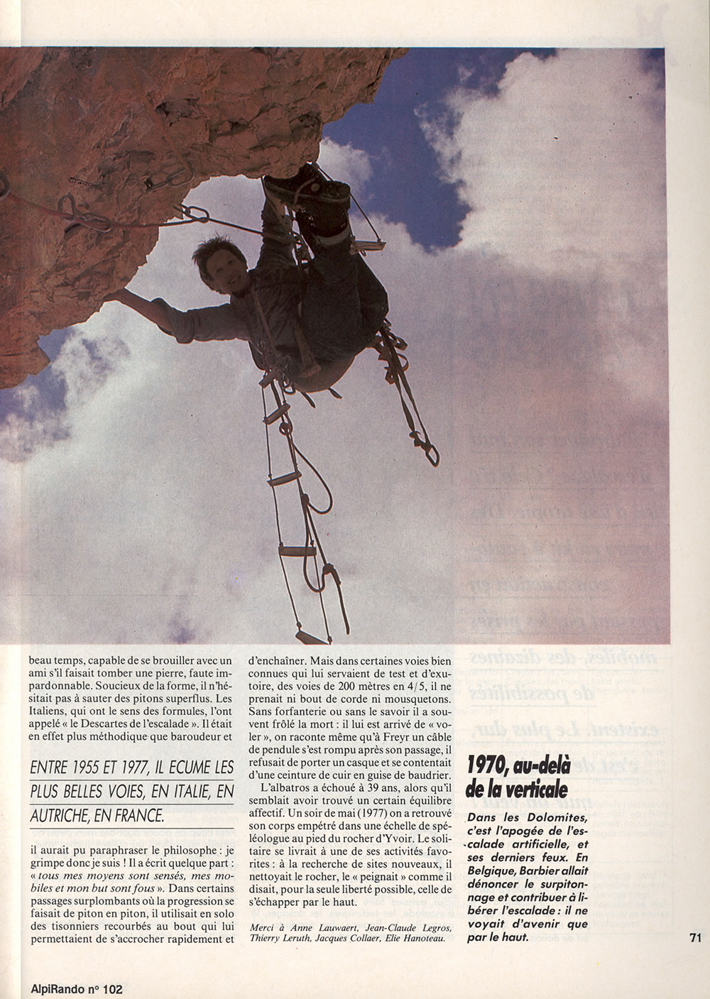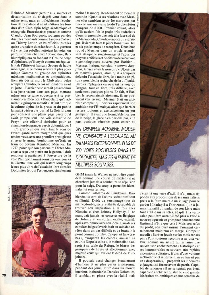 Dans les Dolomites, c’est l’apogée de l’escalade artificielle, et ses derniers feux. En Belgique, Barbier allait dénoncer le surpitonnage et contribuer à libérer l’escalade : il ne voyait d’avenir que par le haut.