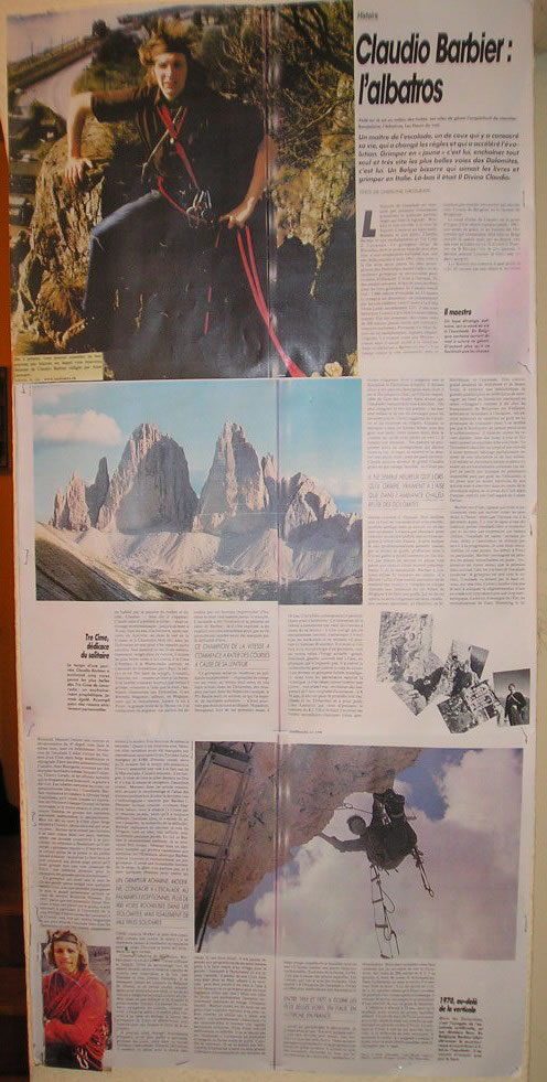 Barbier est d’une rigueur qui frôle le puritanisme mais qui surtout remet les pendules à l’heure : alors que l’époque est à la pitonnite aiguë, il y voit le signe d’une décadence, prône l’escalade libre et économique et invente une expression qui restera célèbre, l’escalade en jaune : certains pitons, utiles à l’assurance, ne doivent pas servir à la progression, ils sont donc intouchables, ils sont jaunis. Au début, à Freyr en particulier, Barbier envisageait de peindre les pitons intouchables en jaune : l’expression est restée mieux que la peinture mais surtout l’idée est à la base de l’escalade moderne : le grimpeur est seul avec le rocher, l’escalade va éclater par le haut niveau, par une élite. Certes Claudio n’est pas le seul à critiquer la dégénérescence d’une escalade soit trop sécuritaire soit trop technologique, il a été en Allemagne de l’Est, les revendications de Gary Hemming et de Reinhold Messner (retour aux sources et dévalorisation du 6e degré) vont dans le même sens, mais en infléchissant l’évolution de l’escalade il allait s’attirer les foudres d’un Club alpin belge académique et rétrograde. Entre des têtes pensantes comme Claudio, Jean Bourgeois, soutenus par des disciples mordants comme Jacques Collaer ou Thierry Leruth, et les officiels installés qui se drapaient dans la sécurité, la guerre a été vive. Les rebelles nettoient les voies, on perquisitionne chez eux ! Scandalisé, Barbier répliquera en fondant le Groupe Belge d’Alpinistes, qu’il voyait comme un équivalent de l’élitiste et français Groupe de Haute Montagne, et le moins sérieux et plus polémique Gamma ou « groupe des alpinistes méchants malhonnêtes et antipathiques ». Bien sûr dès sa mort le Club alpin belge récupéra Claudio, héros national qui avait vu juste… Barbier ne se sentait pas reconnu à sa juste valeur dans son pays, mettant même une certaine coquetterie à se proclamer, en référence à Baudelaire qu’il admirait, «grimpeur maudit». Il faut dire que la culture alpine de la presse et du public laissait à désirer : le journal Le Soir (4) lui a un jour consacré une pleine page parce qu’il avait grimpé seul une voie classique de Freyr : une célébrité dérisoire pour ce champion des grandes parois dolomitiques !