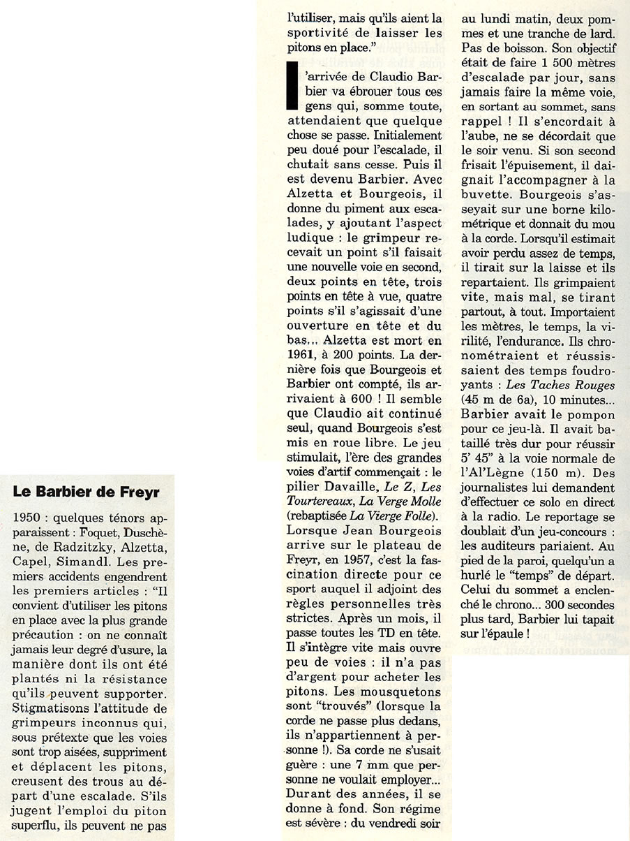 Portraits et évocations1992 – « Ma Freyr », par Jean-Claude Legros Dans un article publié dans la revue « Vertical », en juin 1992, Jean-Claude Legros consacre quelques paragraphes à Claudio Barbier, intitulés : « Le Barbier de Freyr ». 1992 Jean-Claude Legros, »Ma Freyr » (Vertical, juin 1992)