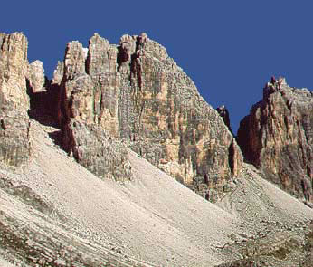 Sestup: Po hřebeni doprava až do sedla mezi severní a jižní vrchol Lagazuoi. Po staré ferratě na suť a po ní pod nástup.