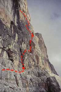 O téhle cestě náš průvodce říká, že skála, modelovaná často protékající vodou, je strmá, drsná a velmi pevná, prostě ideální pro povyražení z lezení (to je teda překlad). Jenže taky říká, že to je odpověď na technologické trendy lezení po skobách, návrat dobrodužství do hor a jiné věci ani neříká, ale to ukáže později. V noci bylo hodně zima a to značí pěkné počasí přes den. To, a že má Drago devět délek rozhodlo, že jdeme na lanovku. Pravda, žena brblá, že se jí nelíbí klíčové místo, ta drobivá spára ve třetí délce, ale já si to slibované povyražení z lezení nedám vymluvit. Přece jen si chci připomenout staré časy a vylézt něco těžšího. A kromě toho jedna drobivá spára v devíti délkách nehraje takovou roli, když je tam ta pěkná černá skála. Zajímavé, jak se člověk něčím namladí a ani ho netrkne, že když tu cestu dělal Claudio Barbier v roce 1969 a měla být ukázka skobovačům, co se dá vylézt volně, že to asi nebude jen tak nějaká fajnová procházka.