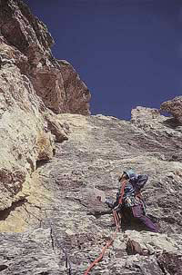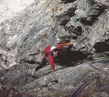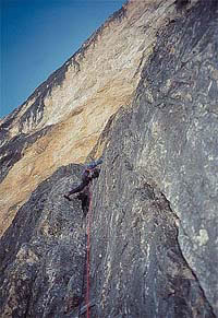 Ofukuju spáru, aby mi neklouzala žába. Zaklemuju nohu, ještě krok v převislé spáře, ještě jeden a už je na dosah další smyčka, která přijde docela vhod. Někdo zatloukl až nahoře skobu a prodloužil ji skoro jedenapůlmetrovým popruhem. Ještě dva delikátní kroky hlínou popráškovanou, mírně převislou spárou. Jestlipak mi neujedou kecky? Neujely. Držím konec spáry a klíčové místo mám v kapse.