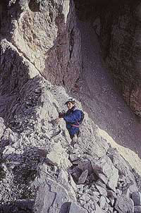 Poslední délka je za tři plus. To plus je zřejmě za lámavost. Místo dvou skob je na konci cesty jen jedna, ale to už nevadí. Máme Drago a to činí únavu příjemnější. Teď ještě sestup. Slaňovat cestou se nám nechce a volíme jihozápadní hřeben. Zanedlouho jsme v sedle, ale k suťovému žlabu je ještě skoro osmdesát metrů strmé stěny. Při bližším prozkoumání jsme našli starou neudržovanou feratu, o které se náš průvodce jaksi zapomněl zmínit, a po ní scházíme na suť. Je půl páté a poslední lanovku dolů už nemůžeme stihnout, leda vrtulníkem. Ach jo. to dostanou kolena zase zabrat!