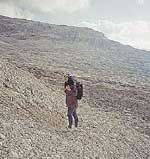 Od lanovky koukáme, kde že to je ten náš kopec. Asi támhleten dole vzadu. A je tu dost lidí s batohama, kolik jich asi jde tam, co my? Nástup je vlastně sestup dolů. Proto byl údaj o převýšení nástupu v průvodci vyčárkovaný. Od rozcestníku ve Forcella di Lagazuoi jdeme skoro po vrstevnici cestou vyšlapanou v suti. Pořád koukám na černobílý výtisk fotky z průvodce a na kopec, který jsme určili nahoře a stále více pochybuji, že to je on. Taky že není, je to ten výš a blíž, který zeshora vypadal jako součást jižního vrcholu Lagazuoi. Teď už začíná být vidět rokle, která ho dělí od jižního souseda a začíná se i podobat vytištěné fotce, která je nevímproč vzatá z téměř opačné strany, než ze které se přichází. Tak sláva, máme ten správný kopec, první předpoklad úspěchu. Za chvíli jsme pod ním a noříme se do stínu a chladu západní stěny. Vypadá důstojně a nepříliš přístupně. Ani se nedivím, že sem z těch lidí, co jeli s námi, nikdo nešel. Na takovéhle stěně návaly nebudou. Začátek vypadá ponuře, zvláště pak ty vlhké komíny nástupové délky. Je tu štand se smyčkami ve skobách, takže jsme tu dobře. Eva zase brblá, ale říkám: « Podíváme se tam a uvidíme. Slanit se dá vždycky. » Vidina slibované černé pevné skály mi dodává mírného optimismu. Komín šel celkem dobře odšlapat rozporem a lezení bylo takové, jaké by se od V- dalo očekávat a hezčí, než to zpočátku vypadalo. Druhá délka už opravdu je v té slibované pěkné černé skále, drsné jako struhadlo. Proč si na tohle bral někdo z našich předchůdců magnézium, jehož stopy jsou tu a tam vidět, nechápu.