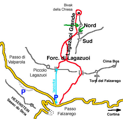 Nástup Po pěšině po vrstevnici pod stěnami Lagazuoi Grande až pod stěnu severního vrcholu, půl hodiny od horní stanice lanovky.Výstup: