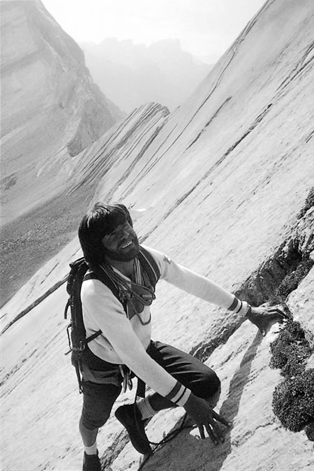 Nel suo articolo, Messner, che non aveva timori di alcun genere e diceva pane al pane facendo pure i nomi, indicava esempi di questo abuso di mezzi artificiali in voga in quegli anni. Come la Via degli Strapiombi, lungo la parete Est della Cima d’Ambiez (Gruppo del Brenta). L’avevano aperta, tutta in artificiale tranne la parte iniziale, Dietrich Hasse, Heinz Steinkötter e Claude Barbier.