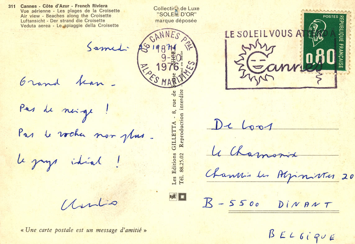 Carte de Cannes envoyée aux époux De Loos, patrons du « Chamonix » à Freyr (9 octobre 1976)