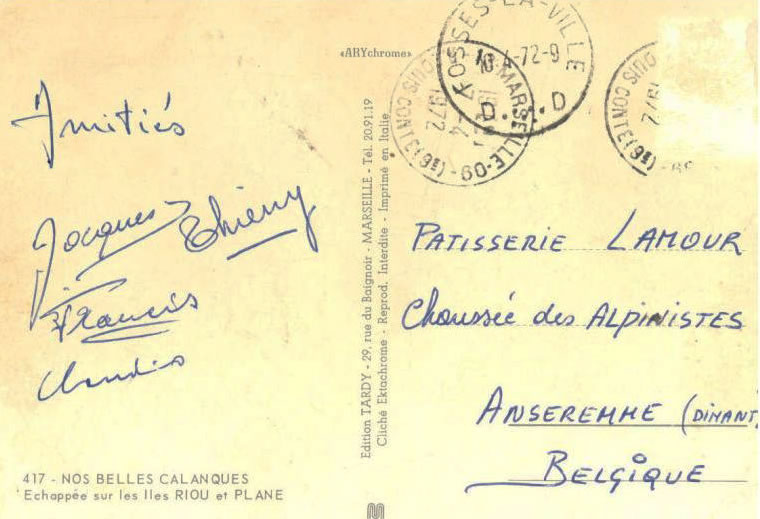 Cartes postales et lettresCarte des Calanques envoyée à la Pâtisserie Lamour (Freyr) (avril 1972) Amitiés Jacques, Thierry, Francis, Claudio Carte des Calanques envoyée à la Pâtisserie Lamour (Freyr) (avril 1972)