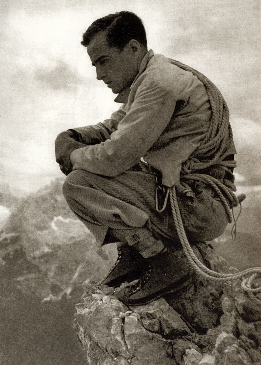 Le 19 octobre 1940, à Selva di Val Gardena, celui qui, après Preuss, a probablement été le plus grand et le plus génial grimpeur de tous les temps, alla faire une promenade avec trois amis et une jeune fille. Les trois voulaient s’exercer en roche et il les conduisit à une petite paroi, au fond d’un vallon, qui convenait bien pour l’entraînement : un aplomb d’une cinquantaine de mètres au-dessus duquel il y avait encore des bois et des prés. Les trois amis s’encordèrent et commencèrent à escalader. Restée seule avec le grand grimpeur, la jeune fille lui dit qu’elle aussi aurait aimé essayer. Il n’avait pas de seconde corde ; alors il chercha dans le sac d’un de ses amis, et y trouva trois vieilles cordelettes, de celles qu’on utilise pour les descentes en rappel. Il les noua entre elles et ainsi assura tant bien que mal la jeune fille. Naturellement, avec ce genre de ficelle, il n’était pas question de l’amener dans des endroits difficiles.