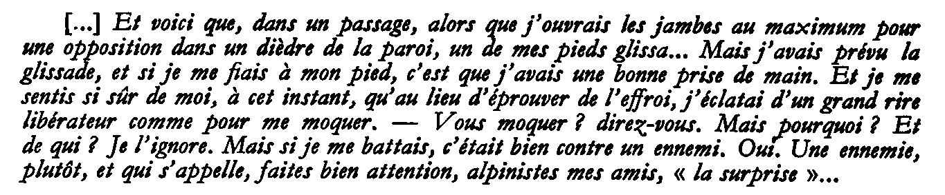 [« Je pourrais difficilement exprimer cette ivresse, cette joie de me sentir complètement seul sur cette formidable paroi… Quelle joie ! Joie de vivre ; plénitude ; orgueil intime de me sentir assez fort pour dominer tout seul le vide et le surplomb. Quelle volupté ! »]