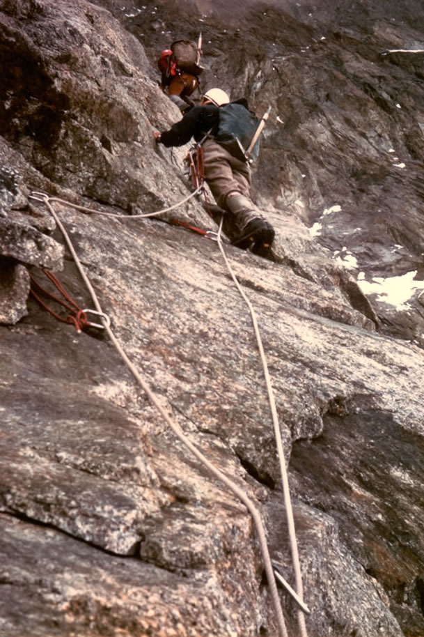 We had only climbed for two more bitches when the mist enveloped us in its ominous shroud, thus awakening us to a rality that we hadn’t been aware of: that there had most probably been a slight bit of good old common sense in the « wimps » decision to retreat. As the first flakes settled on my helmet, heralding what was inevitably to come. I started off on the next pitch. Roger tried in vain to entice me back, but somehow when the worst is upon me I have this maddening craving to be heroic. But lightning glued my fingers to a carabiner and upon jerking the twitching member free, I reseeded back into my natural human garb. In other words, I blush to admit, I was scared. I took Roger up on his most generous offer to lower me back down tohis minute ledge. It was snowing quite hard by then so out with the bivi tent, great invention, on with down jackets and oieds d’elepfants(that is to say mine as Roger only had a plastic bag to shelter his feet, and we settled our rear cheeks most miserably upon what purchase there was. Our only protection was a sling-treaded moac (nut). As I recall the vieuw downthe face was quite ethereal, the snow blanketing the precipitous wallsbelow.