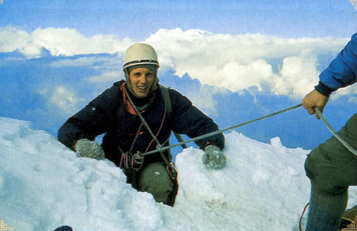 I tied one of Claudio’s ropes to my harness and the Italians clipped one of theirs to Claudio’s companion Bernard (Hanotteau). One big happy family. I tend to recall that Claudio appeared to be quite drained of all colour. He seemed very upset, even scared. But this seemed most implausible because so contrary to what his reputation would logically lead one to believ. Had not this man soloed all three North Faces of the Lavaredo in one day? I did notknow then as I do today of his phobia concerning snow and ice. I don’t want to down grade him in anyone’s eyes for he was to become a most feeling andgenerous friend and I for one most sorely miss him.