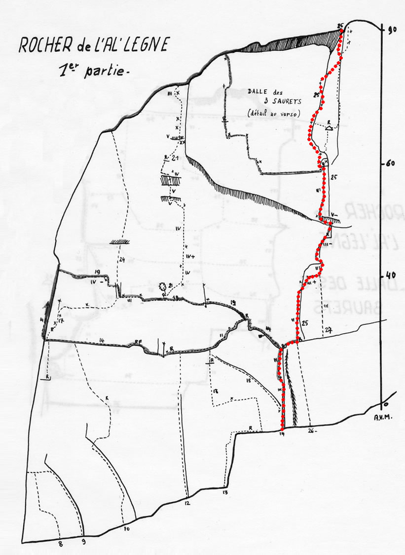 Bien entendu, la suppression de certains pitons devrait toujours être accompagnée d’une révision du pitonnage général de la voie. Par principe, avant des passages très difficiles, j’aime trouver deux bons pitons. Deux précautions valent mieux qu’une : un piton peut s’arracher, un mousqueton peut casser. Exemple : le surplomb de la deuxième longueur de la voie Lecomte, où deux pitons successifs, qui faisaient de ce surplomb un passage artificiel, ont été enlevés et remplacés par deux pitons d’assurance pure, placés sous le surplomb.