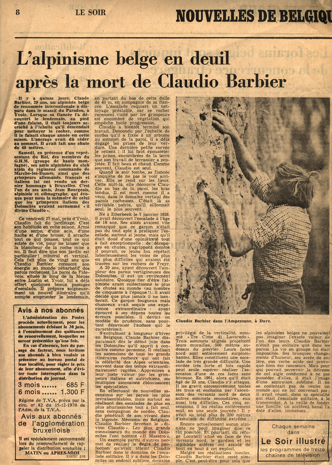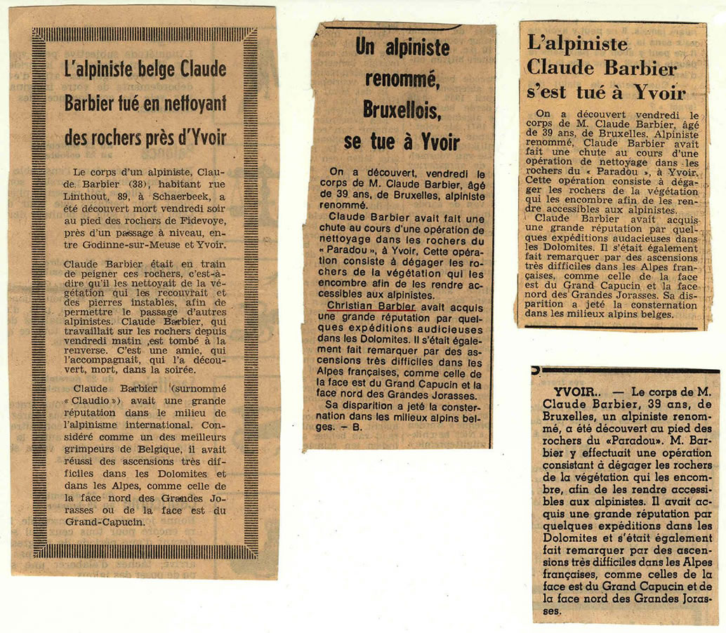 Il y a quinze jours, Claude Barbier, 39 ans, un alpiniste belge de renommée internationale a disparu dans le massif du Paradou, à Yvoir. Lorsque sa fiancée l’a découvert le lendemain, au pied d’une falaise, il était toujours accroché à l’échelle qu’il descendait pour nettoyer le rocher, comme il le faisait chaque année en cette saison. L’ancrage avait dû céder au sommet. Il avait fait une chute de 40 mètres.