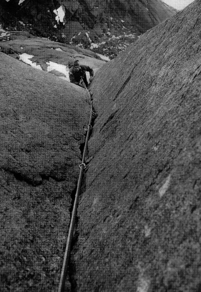 La deuxième sorte d’escalade est l’adaptation de l’homme à la montagne et c’est là seulement que réside la difficulté alpine. L’homme se forme pour la montagne. L’entraînement, la dextérité et une grande part de courage lui permettent de s’élever grâce aux prises et aux fissures existantes. Je qualifie ce genre d’escalade rocheuse comme le véritable, le plus beau, en bref : l’alpinisme classique.