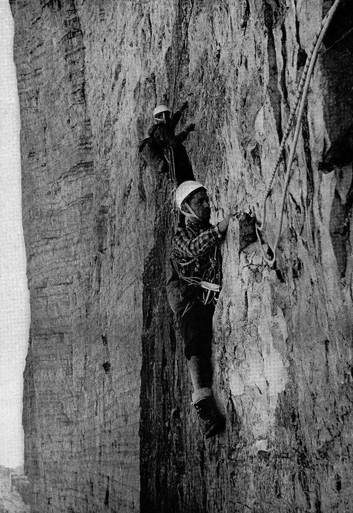 Il est vrai que l’escalade artificielle s’est perfectionnée et que l’histoire alpine a encore enregistré une quantité de grandes premières depuis les années trente. Alors que la difficulté d’une voie classique peut rester invariable, sauf modifications dues aux éléments naturels, la difficulté des voies artificielles n’est pas identique pour les répétiteurs et pour les premiers ascensionnistes. Pas d’objection contre les nouvelles voies ! Mais au moins laissez les voies anciennes dans leur état originel ! Il faut qu’elles prouvent aux répétiteurs que les «anciens» étaient des hommes forts et courageux. Il faut que les voies anciennes restent des exemples, parce qu’elles représentent un sommet d’une évolution – même à l’époque actuelle.