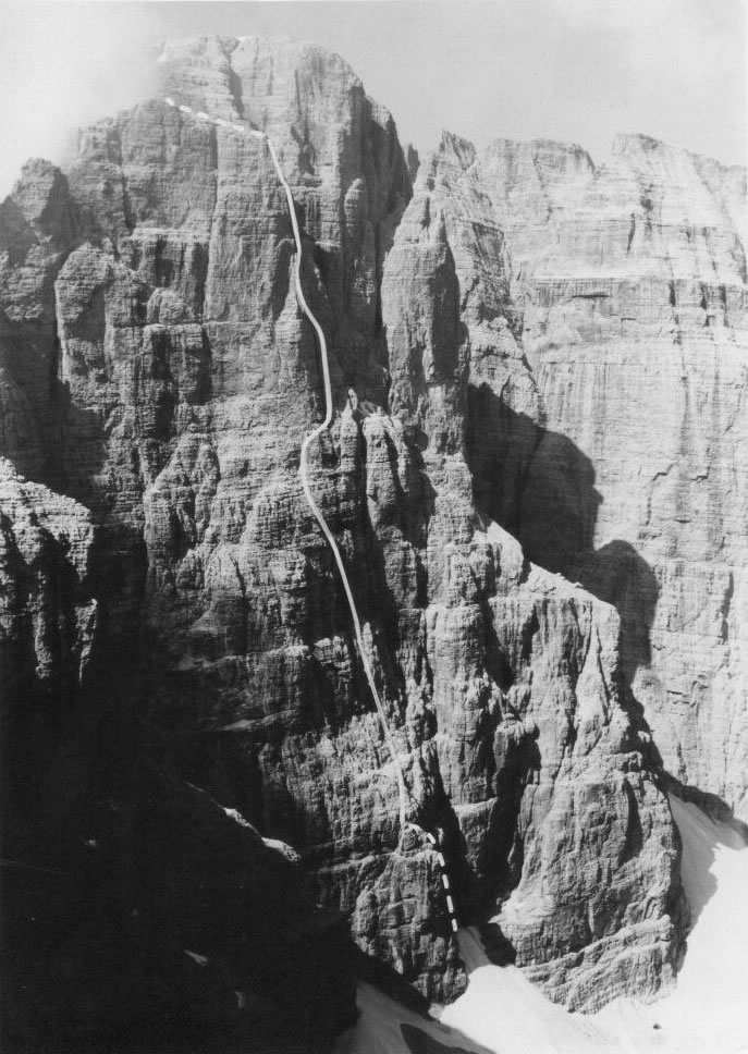 Voie nouvelle sur la face nord-est, à droite de la voie des frères Detassis, le 30 août, par Claudio Barbier et Jean Bourgeois. Très belle escalade en excellent rocher. Elle devrait devenir classique. 700 m, D, 1 piton, 5 h.