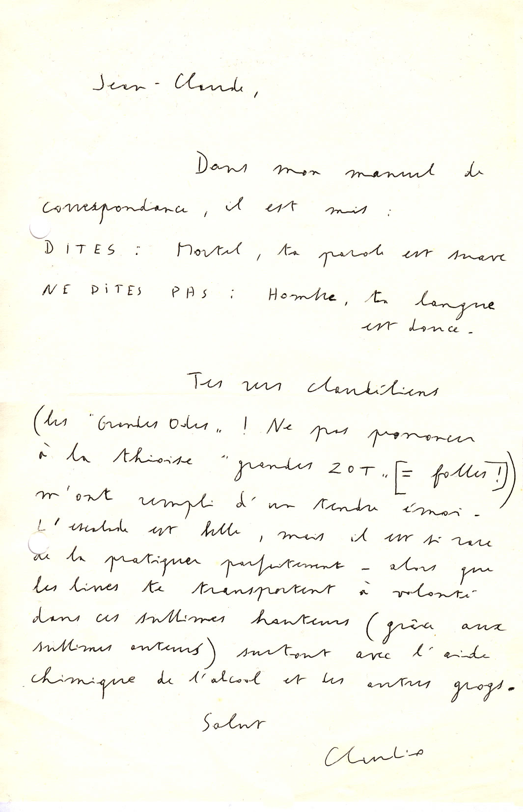 Tes vers claudéliens (les « Grandes odes » ! Ne pas prononcer à la thioise « grandes ZOT » [=folles !]) m’ont rempli d’un tendre émoi. L’escalade est belle, mais il est si rare de la pratiquer parfaitement – alors que les livres te transportent à volonté dans ces sublimes hauteurs (grâce aux sublimes auteurs) surtout avec l’aide chimique de l’alcool et les autres grogs.