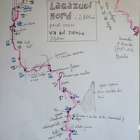 | L12 | IV- | 20 m | Sortir par une fissure noire. Relais sur une grande vire. ##Descente À la fin de l'escalade se diriger vers le col au S (à droite) par des bonnes vires. Après un peu de désescalade facile pour arriver à ce col, on redescend dans les pierriers pour récupérer le bon sentier qui ramène au Passo Fazalrego. |