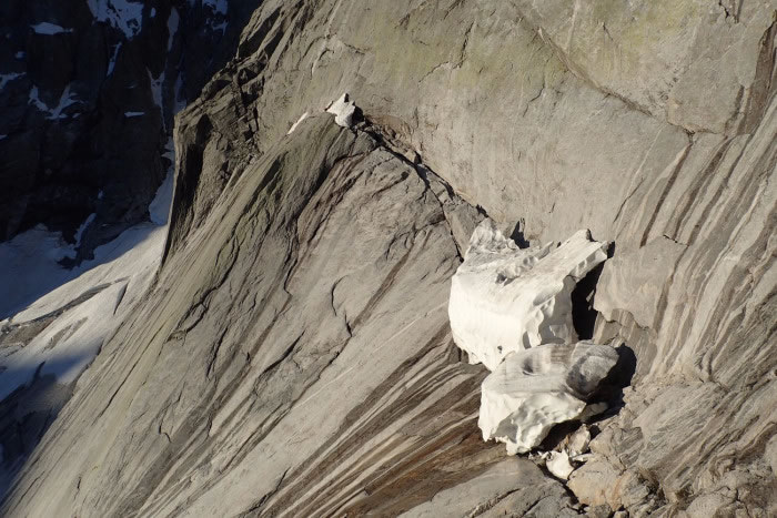 Ce sont là de très beaux principes. Mais la séparation ne laisse pas d’être désagréable. Je perds la compagnie des quatre grimpeurs qui continuent à s’élever, alors qu’il me faut commencer à redescendre, et tout seul ! Descente facile d’ailleurs, mais les ennuis arrivent bientôt : la neige abondante de l’hiver s’est accumulée sur le système de vires qui conduisent vers le milieu de la face. La plus grande partie s’est effondrée, laissant une espèce de front de glacier suspendu.