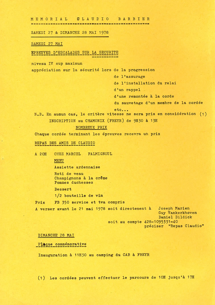 Dans son bulletin de mai 1978, le Club Alpin Belge consacre une page à l’annonce du « Mémorial Claudio Barbier » organisé à Freyr les 27 et 28 mai 1978.