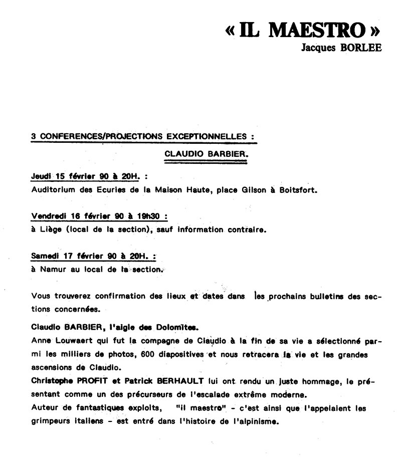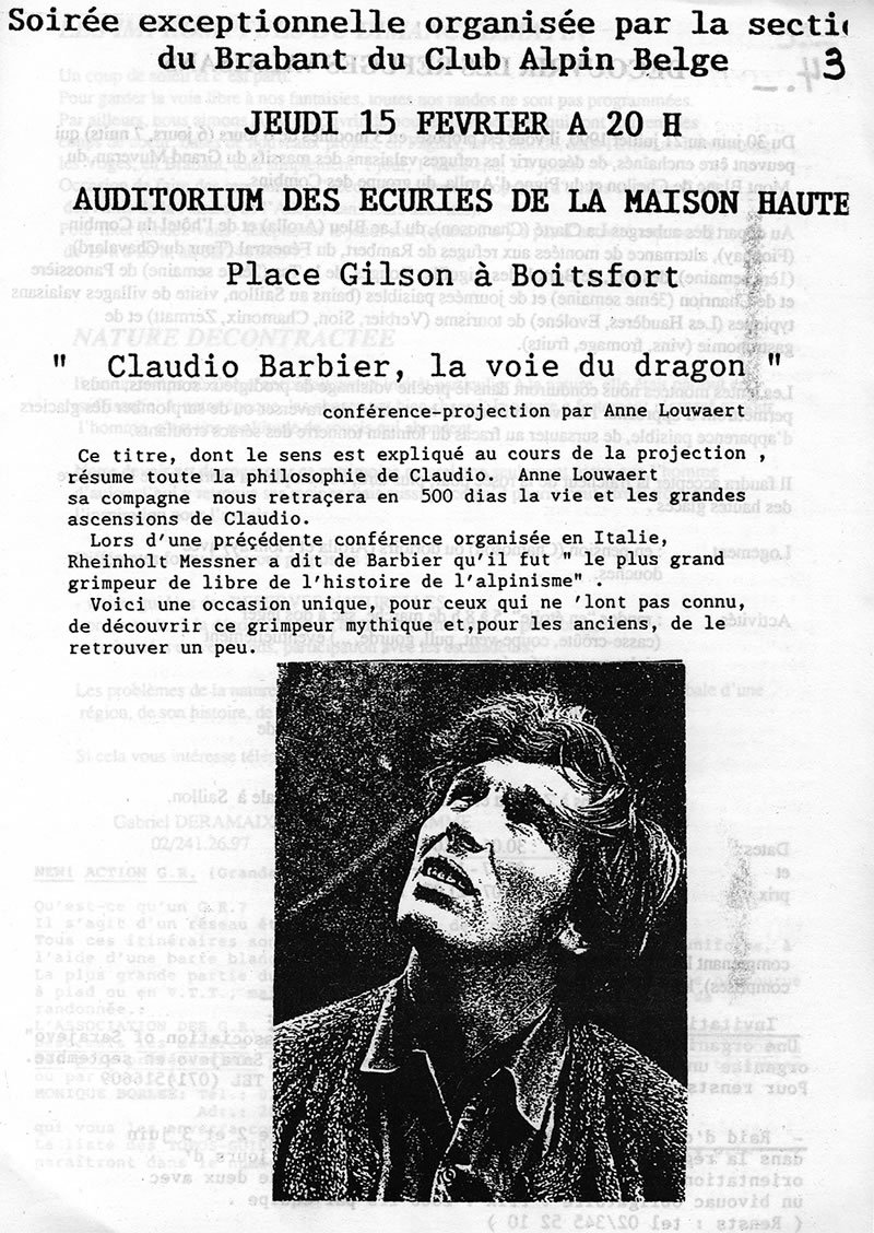 En février 1990, trois conférences avec projections sont organisées par le Club Alpin Belge à Bruxelles (Boitsfort), Liège et Namur. Anne Lauwaert y présente un montage de 500 diapositives.