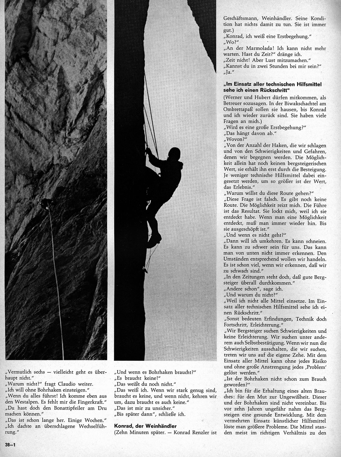 – Je suis pour un usage plus ancien : celui du courage dans l’affrontement de l’inconnu. C’est un principe incompatible avec les pitons à expansion. Jusqu’à il y a environ dix ans, l’alpinisme se développait suivant une ligne saine et cohérente : pour résoudre les gros problèmes on devait naturellement faire un plus grand usage de moyens artificiels, mais ceux-ci se maintenaient en rapport équitable avec les difficultés. Puis quelques grimpeurs se mirent en tête de vaincre en droite ligne les parois surplombantes en les transperçant avec les pitons à expansion, et ils appelèrent cette besogne «progrès technique». Appuyés par la presse, ces ferrailleurs ont ensuite suggestionné les jeunes, et ainsi maintenant tous utilisent les pitons à expansion, ne se rendant pas compte qu’ils vont à l’envers du but. Il est naturel et juste que chaque génération désire faire quelque chose de plus que les précédentes : les nombreux records sportifs battus tous les ans en sont une preuve éloquente. Dans l’escalade également, des progrès ultérieurs seront possibles, mais seulement à la condition que l’usage des procédés artificiels soit limité.