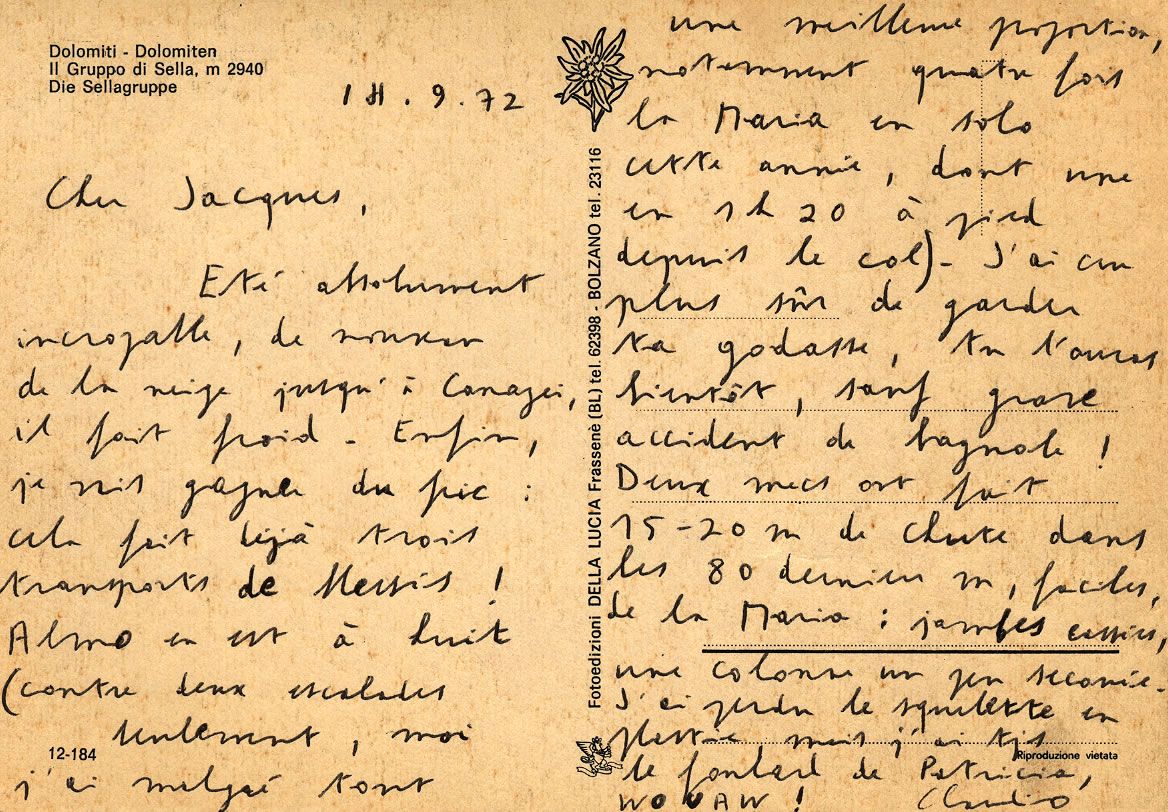 Eté absolument incroyable, de nouveau la neige jusqu’à Canazei, il fait froid. Enfin, je vais gagner du fric : cela fait déjà trois transports de blessés ! Almo en est à huit (contre deux escalades seulement, moi j’ai malgré tout une meilleure proportion, notamment quatre fois la Maria en solo cette année, dont une en 1h20 à pied depuis le col).
