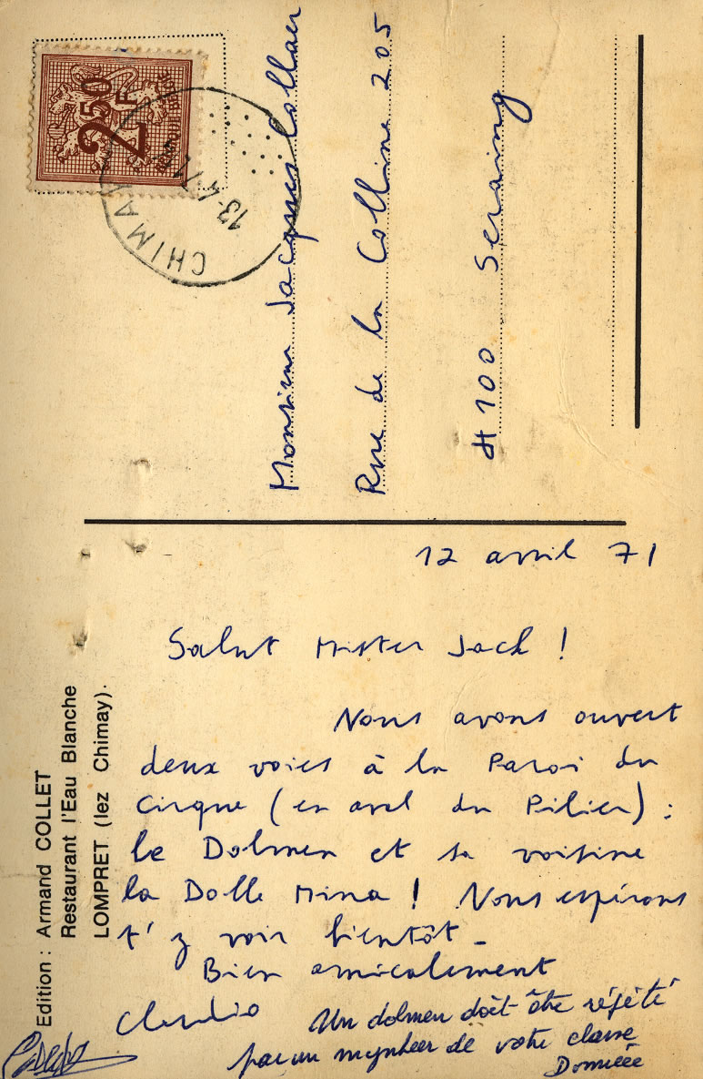 Cartes postales et lettresCarte à Jacques Collaer (17 avril 1971) 12 avril 71 Salut Mister Jack ! Nous avons ouvert deux voies à la Paroi du Cirque (en aval du Pilier) : le Dolmen et sa voisine la Dolle Mina ! Nous espérons t’y voir bientôt. Bien amicalement Claudio (cosignataires à identifier) Carte à Jacques Collaer (17 avril 1971)