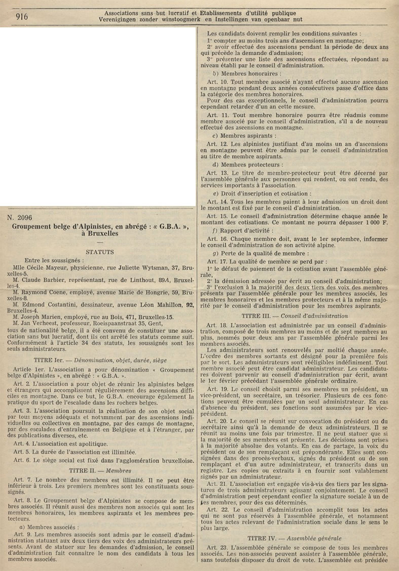 Art. 2. L’association a pour objet de réunir des alpinistes belges et étrangers qui accomplissent régulièrement des ascensions difficiles en montagne. Dans ce but, le G.B.A. encourage également la pratique du sport de l’escalade dans les rochers belges.