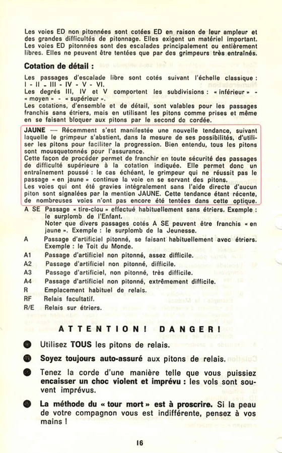 Une autre idée qui devrait faire son chemin est celle du « jaunissement » des voies, qui consiste à passer en n’utilisant les pitons de progression que comme pitons d’assurance. D’assez nombreuses voies, ou passages, des Ardennes sont ainsi « jaunis ». Ce qui n’empêche pas, là comme ailleurs, l’« épuration » de faire son chemin »…