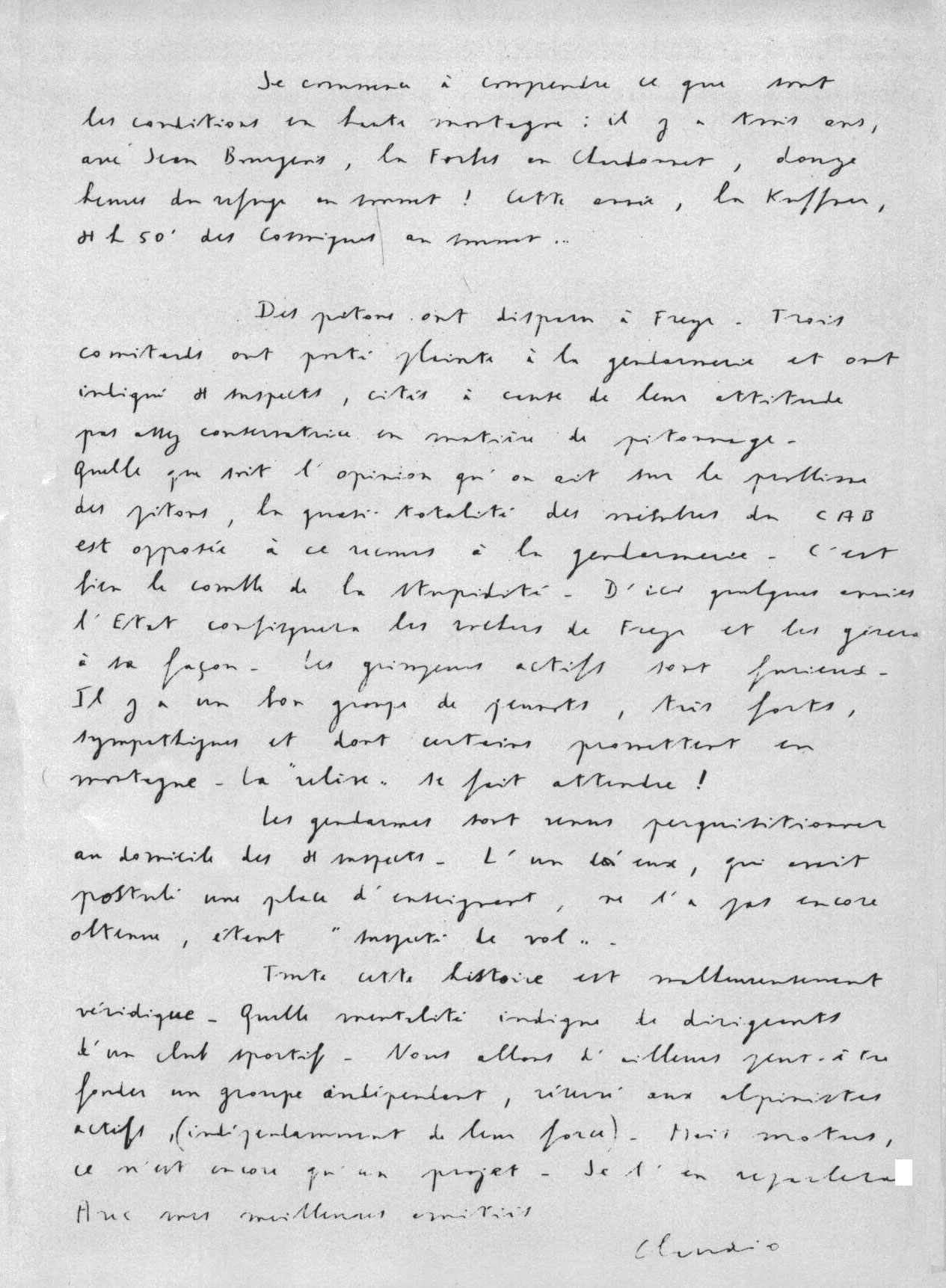Depuis lors, j’ai un peu complété mon activité, moins que je l’aurais désiré, vu le mauvais temps. Mais ce n’est qu’un début ! Si les conditions d’admission n’ont pas été rendues plus sévères depuis lors, je t’avoue que je serais heureux d’être admis au Groupe. Bien entendu je ne considèrerais pas cette admission comme une fin de carrière, mais comme un bivouac à mi-paroi !