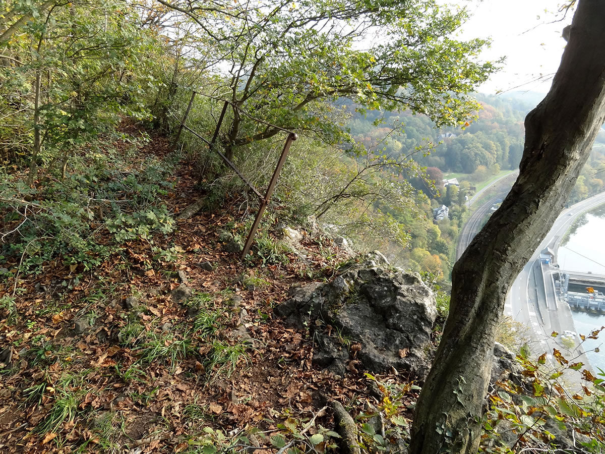 Le premier point d’ancrage possible et sûr est constitué par une balustrade métallique qui se trouve au sommet des rochers, près du bord de la falaise. Cette balustrade y a été placée pour sécuriser un sentier forestier qui longe le sommet des rochers. Haute de 105 cm, elle est longue de 7,40 m, avec cinq montants fixés dans le sol et une traverse à mi-hauteur. Du solide !