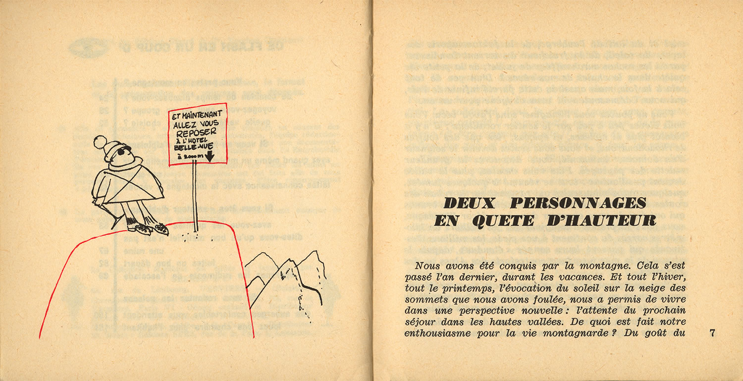 « Ils se sont crus alpinistes en sortant tout équipés d’un magasin de sports. Hélas, la montagne s’apprend comme le reste. Grimper, descendre en rappel, est sans doute à la portée d’un grand nombre, mais il faut d’abord en apprendre l’ABC. Ce n’est pas compliqué, grâce à… Marabout-Flash ».