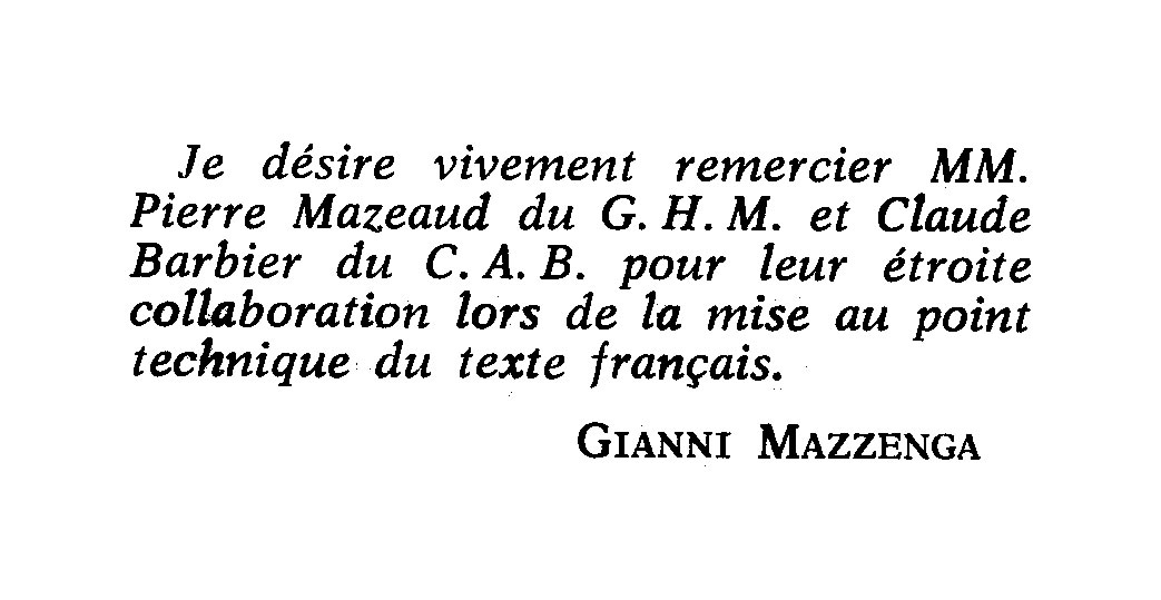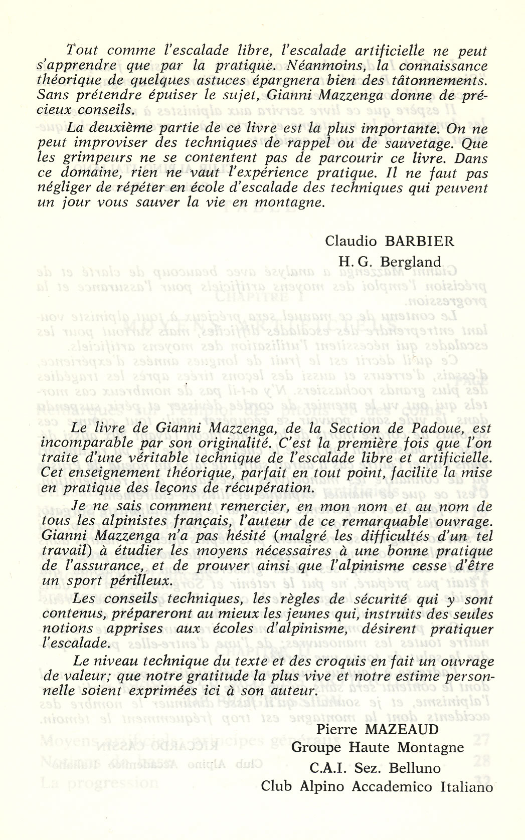 « Sécurité en paroi », version française de « Sicurezza in roccia » de Gianni Mazzenga (C.A.A.I.), est paru en 1967. Les préfaces de l’ouvrage ont été écrites respectivement par Claudio Barbier, par Pierre Mazeaud, et par Riccardo Cassin. Claudio Barbier et Pierre Mazeaud ont également collaboré à la mise au point du texte français.
