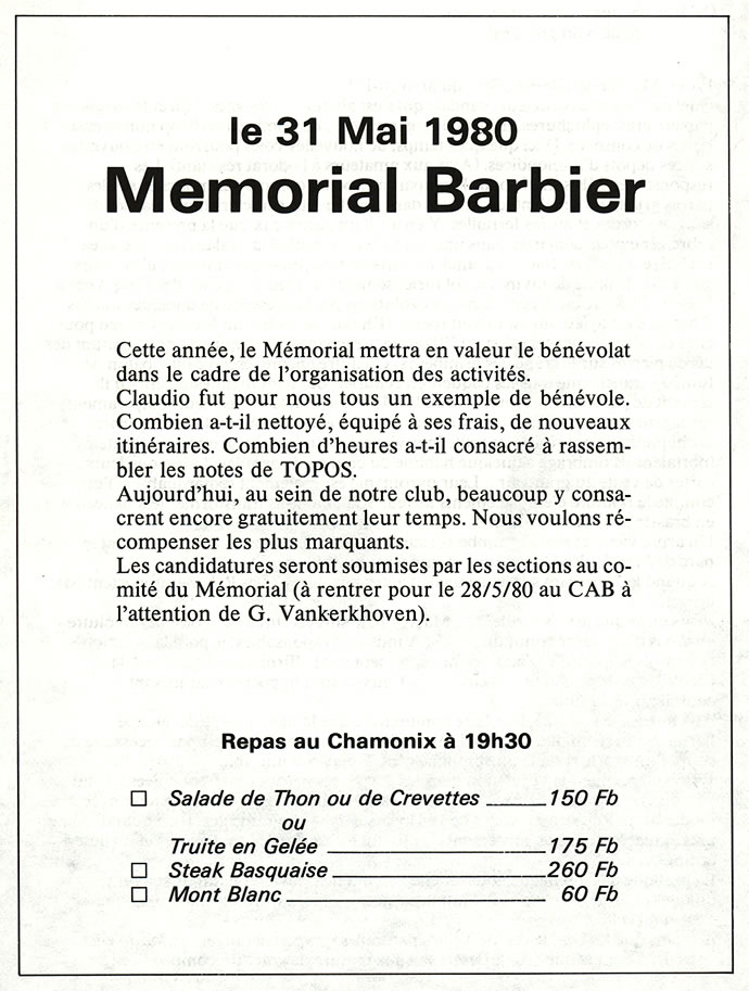 Les fonds en sa possession furent utilisés, au cours des années qui suivirent, pour cofinancer au sein du C.A.B. l’organisation d’un « Mémorial Claudio Barbier ».